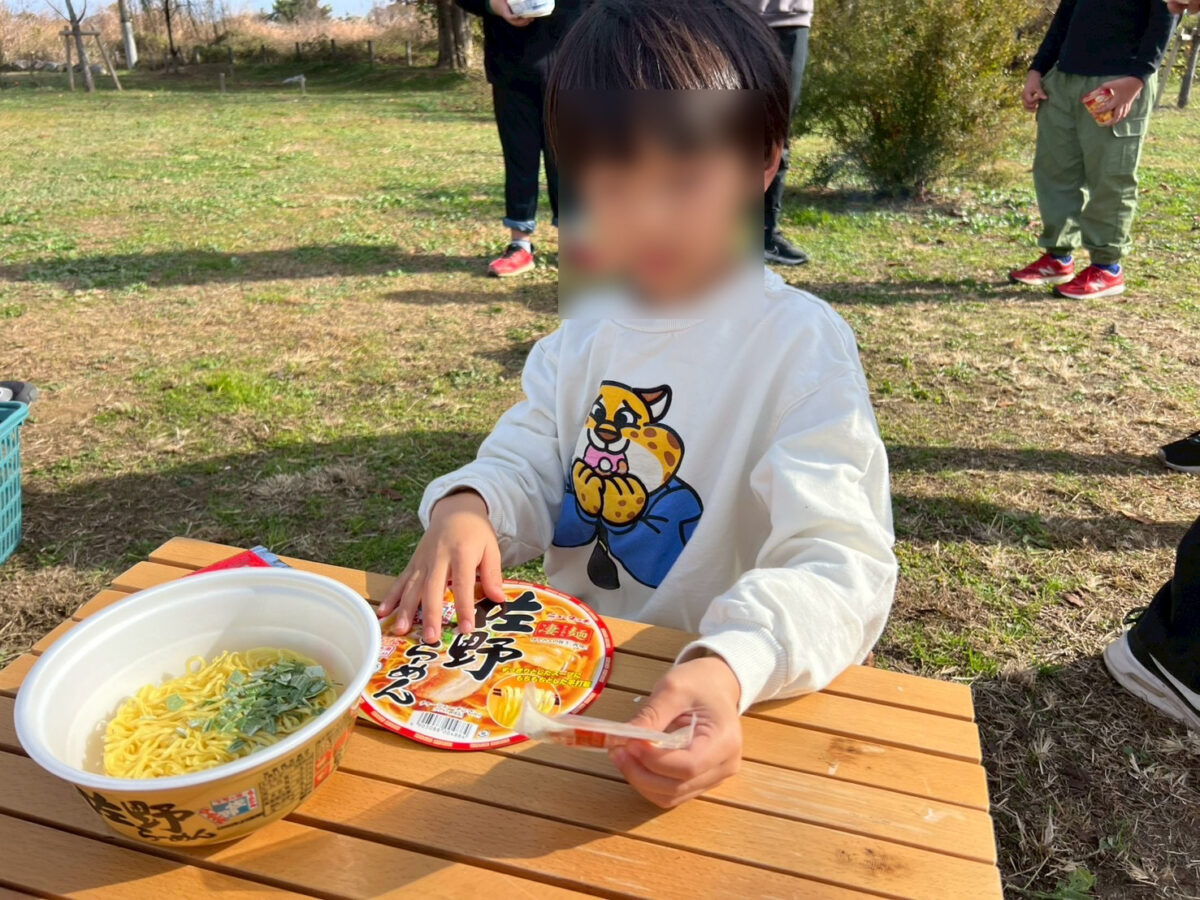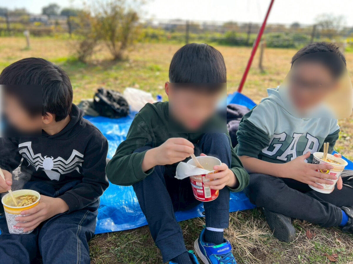自分たちが作った基地の中で、自分たちがつけた火で沸かしたお湯でたべるカップラーメン✨