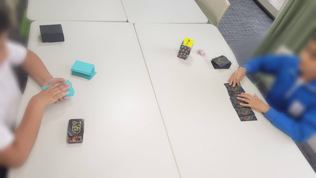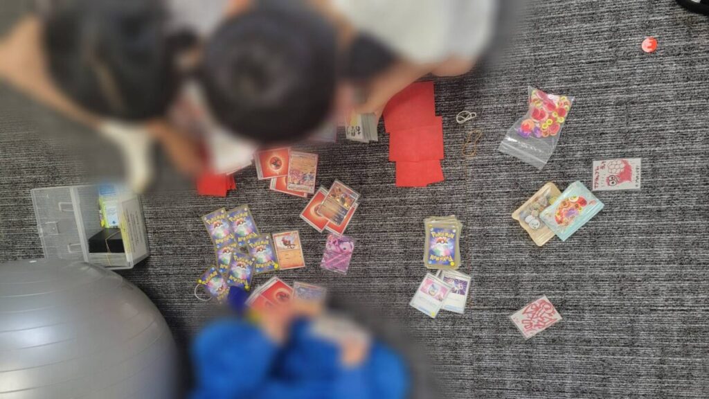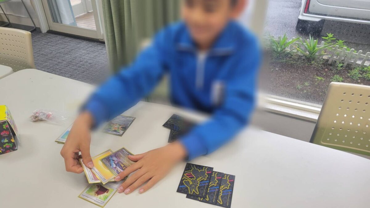 ポケカのテキストは非常に緻密です😫。一文字の違いで効果が変わるため、子どもたちは自然と「 文章読解 」に集中しできています!! 分からない箇所があれば、自分たちで調べたり、詳しい友達に「 的確に質問 」したりする姿が見られます。この「 疑問を言語化して解決する力 」は、学習の基礎になっていますね!